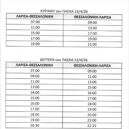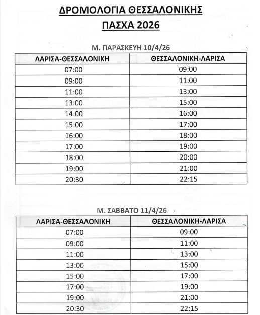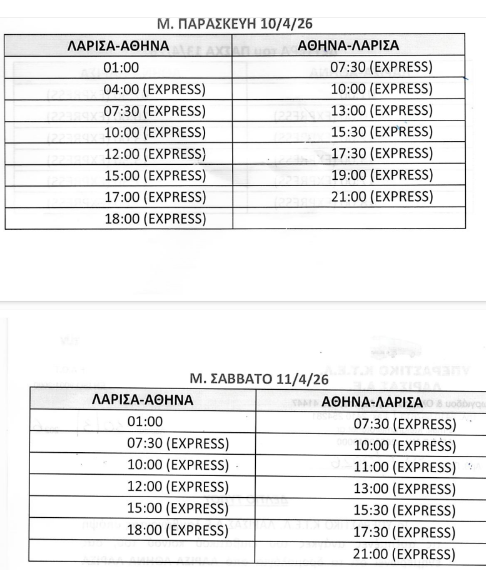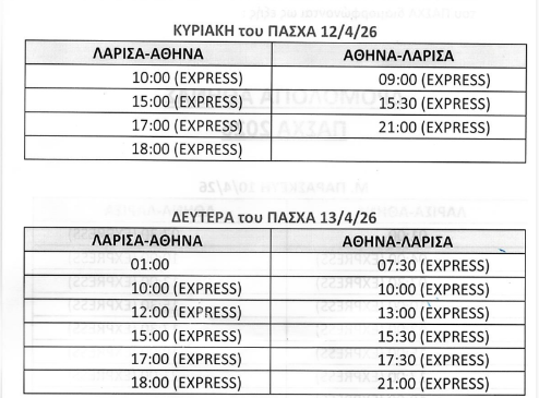 Το Υπεραστικό ΚΤΕΛ Λάρισας ενημερώνει το επιβατικό κοινό ότι, ενόψει της αυξημένης κίνησης κατά την περίοδο του Πάσχα, διαμορφώνονται έκτακτα δρομολόγια για την καλύτερη εξυπηρέτηση των ταξιδιωτών.