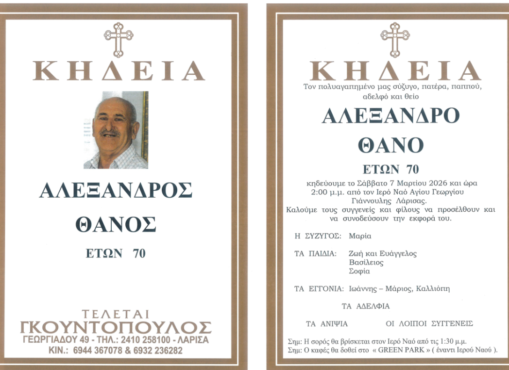 ΑρχικήΕλλάδαΕπικαιρότηταΛάρισα Απεβίωσε ο Αλέξανδρος Θάνος Last updated: 6 Μαρτίου 2026 19:57 elassonapr 7 ημέρες ago Share SHARE Έφυγε από τη ζωή σε ηλικία 70 ετών ο Αλέξανδρος Θάνος. Τα Φάρσαλα άναψαν το χριστουγεννιάτικο δέντρο – Λαμπερή έναρξη των εκδηλώσεων στην ανακαινισμένη πλατεία Δημαρχείου Με απουσίες η ΑΕΛ στη Λεωφόρο Σύρος: Μπλόκο σε κρουαζιερόπλοιο με Ισραηλινούς – Υποδοχή με παλαιστινιακές σημαίες και συνθήματα στο λιμάνι Διακοπή νερού σε οδούς της Λάρισας την Παρασκευή Εισιτήρια με έκπτωση για τους αναπληρωτές εκπαιδευτικούς TAGGED:ΕλλάδαΕπικαιρότιταΛαρισα Share This Article Facebook Email Print Previous Article Σωματείο Συνταξιούχων ΙΚΑ Ν. Λάρισας: Εκδηλώσεις για την Παγκόσμια Ημέρα της Γυναίκας Next Article Μ. Χαρακόπουλος στη Διακομματική για αγροτικό τομέα: Γιατί υπάρχει απόκλιση στις τιμές αγροεφοδίων με άλλες χώρες;