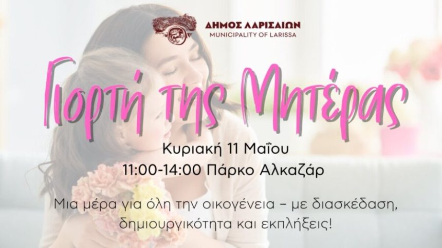 Μια πολύ όμορφη γιορτή, αφιερωμένη στο πιο σημαντικό πρόσωπο στη ζωή όλων μας, τη Μητέρα, διοργανώνει ο Δήμος Λαρισαίων, με τη σύμπραξη των Διευθύνσεων Παιδείας, Πολιτισμού και Πρασίνου, σήμερα, Κυριακή 11 Μαΐου, στο Πάρκο Αλκαζάρ, από τις 11 το πρωί ως τις 2 το μεσημέρι.
