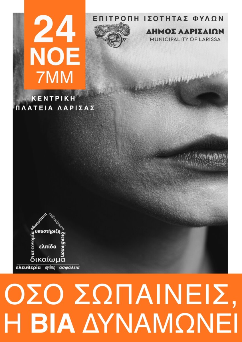 Δράση ευαισθητοποίησης, με θέμα «Όσο σωπαίνεις, η βία δυναμώνει», διοργανώνει η Επιτροπή Ισότητας Φύλων του Δήμου Λαρισαίων, στο πλαίσιο της Διεθνούς Ημέρας για την Εξάλειψη της Βίας κατά των Γυναικών.