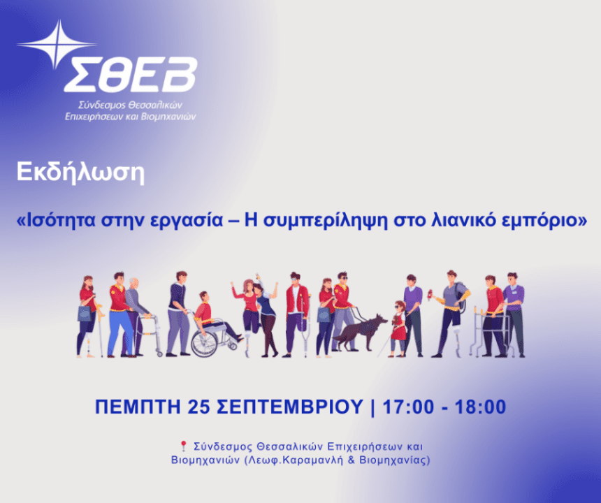 Ο Σύνδεσμος Θεσσαλικών Επιχειρήσεων και Βιομηχανιών (ΣΘΕΒ) σε συνεργασία με το Κέντρο Δια Βίου Μάθησης ΚΑΙΝΟΤΟΜΙΑ διοργανώνει ενημερωτική εκδήλωση με θέμα: «Ισότητα στην εργασία – Η συμπερίληψη στο λιανικό εμπόριο», η οποία θα πραγματοποιηθεί την Πέμπτη 25 Σεπτεμβρίου 2025, και ώρα 17:00 – 18:00, στις εγκαταστάσεις του ΣΘΕΒ (Λεωφόρος Καραμανλή & Βιομηχανίας, 1ος όροφος).