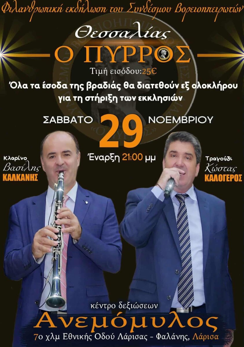 Ο Σύνδεσμος Βορειοηπειρωτών Θεσσαλίας «Ο Πύρρος» διοργανώνει το Σάββατο 29 Νοεμβρίου και ώρα 9.30 στο κέντρο Ανεμόμυλος (7ο χλμ. Λάρισας Φαλάνης) εκδήλωση φιλανθρωπικού χαρακτήρα, με σκοπό την στήριξη των εκκλησιών που επλήγησαν από τις πρόσφατες πυρκαγιές στα χωριά μας. Όλα τα έσοδα της βραδιάς θα διατεθούν εξ ολοκλήρου για αυτόν τον ιερό σκοπό.