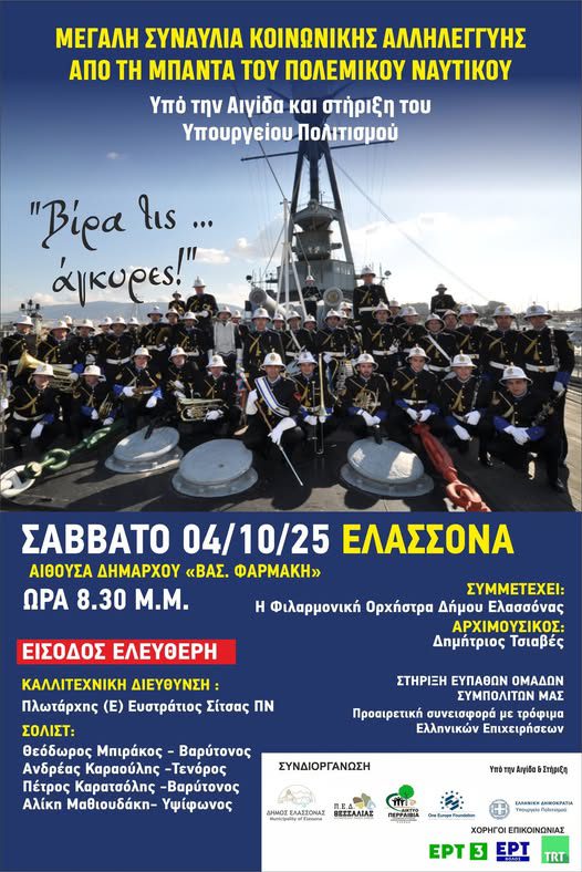 Η περίφημη Μπάντα του Πολεμικού Ναυτικού επιστρέφει στην Ελασσόνα για μια ξεχωριστή συναυλία με τίτλο «Βίρα τις άγκυρες!», σε συνεργασία με τη Φιλαρμονική Ορχήστρα του Δήμου Ελασσόνας. Η εκδήλωση θα πραγματοποιηθεί αυτό το Σάββατο 4 Οκτωβρίου, στις 20:30, στην Αίθουσα Θεάτρου «Δημάρχου Βασ. Φαρμάκη» με ελεύθερη είσοδο για το κοινό.