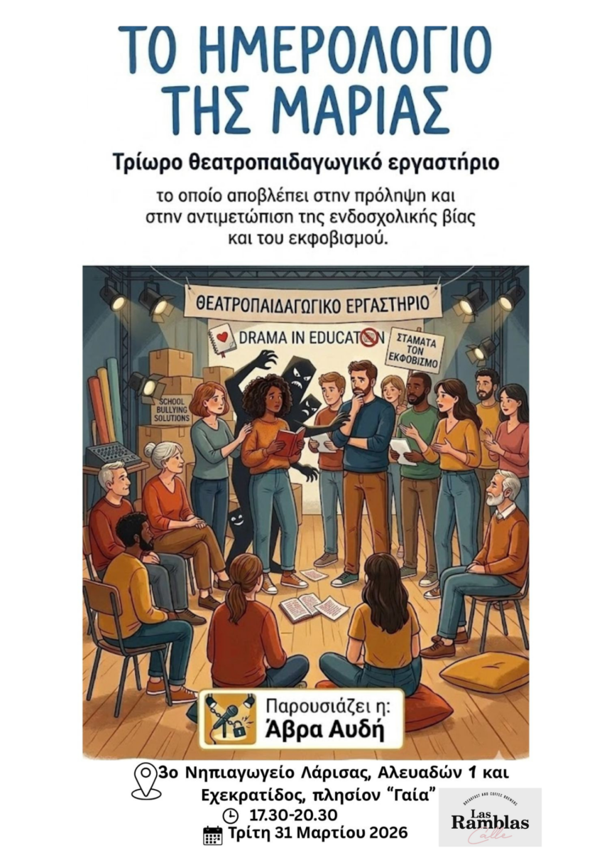 Ο Σύλλογος Εκπαιδευτικών Αγγλικής Γλώσσας και Φιλολογίας Ν. Λάρισας (ETAL) διοργανώνει τρίωρο θεατροπαιδαγωγικό εργαστήριο με τίτλο «Το Ημερολόγιο της Μαρίας» και εμψυχώτρια τη φιλόλογο και θεατροπαιδαγωγό Άβρα Αυδή.