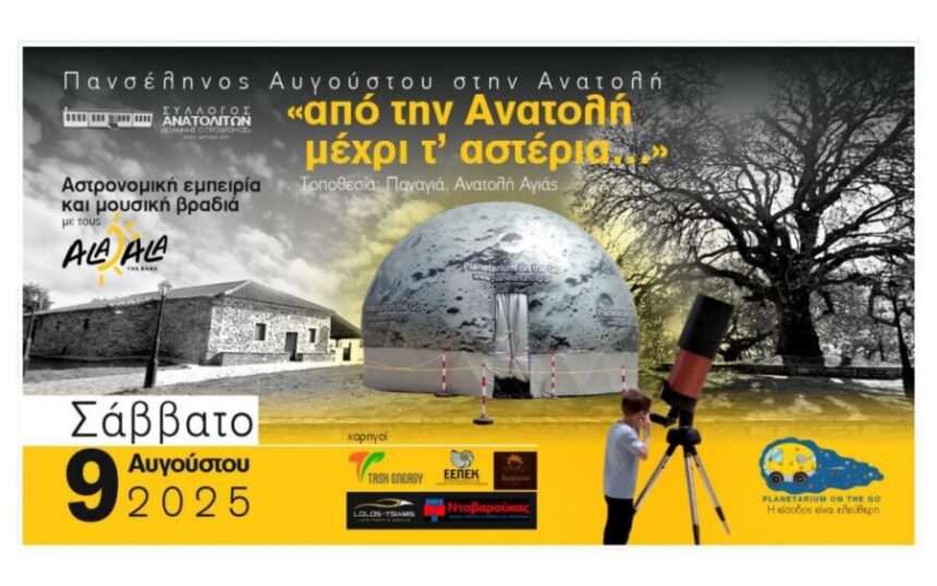 Αστρονομική εμπειρία με το Φορητό Ψηφιακό Πλανητάριο – Planetarium On The Go (19:00–24:00), παρατήρηση ουρανού με τηλεσκόπιο, επαφή με μετεωρίτες και καθοδήγηση από έμπειρο αστρονόμο.