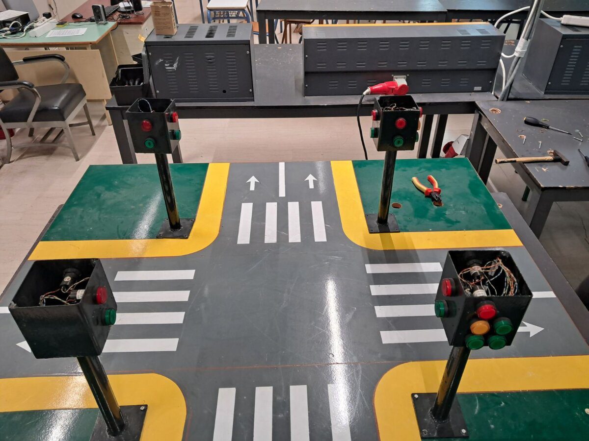 Στο χώρο των εργαστηρίων του 1ου Ε.Κ. Λάρισας μαθητές της Γ΄ Τάξης Ηλεκτρολογίας του 2ου ΕΠΑΛ Λάρισας και οι διδάσκοντες εκπαιδευτικοί τους συνεργάστηκαν για την κατασκευή μιας μακέτας που απεικονίζει μια διασταύρωση με χρήση φωτεινών σηματοδοτών για πεζούς και οχήματα.
