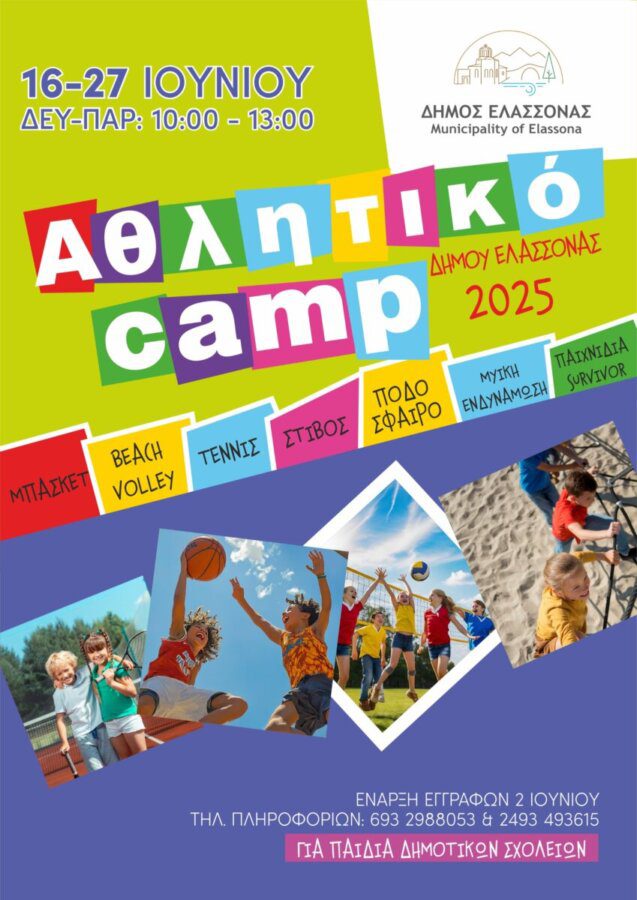 Μέχρι την Παρασκευή 13 Ιουνίου θα μπορούν να υποβάλλουν αιτήσεις οι ενδιαφερόμενοι, για τη δωρεάν συμμετοχή παιδιών δημοτικού στο Καλοκαιρινό Αθλητικό Camp του Δήμου Ελασσόνας, το οποίο επιστρέφει για τρίτη συνεχόμενη χρονιά, προσφέροντας μια αξέχαστη εμπειρία γεμάτη παιχνίδι, μάθηση και άθληση για τα παιδιά του δημοτικού.