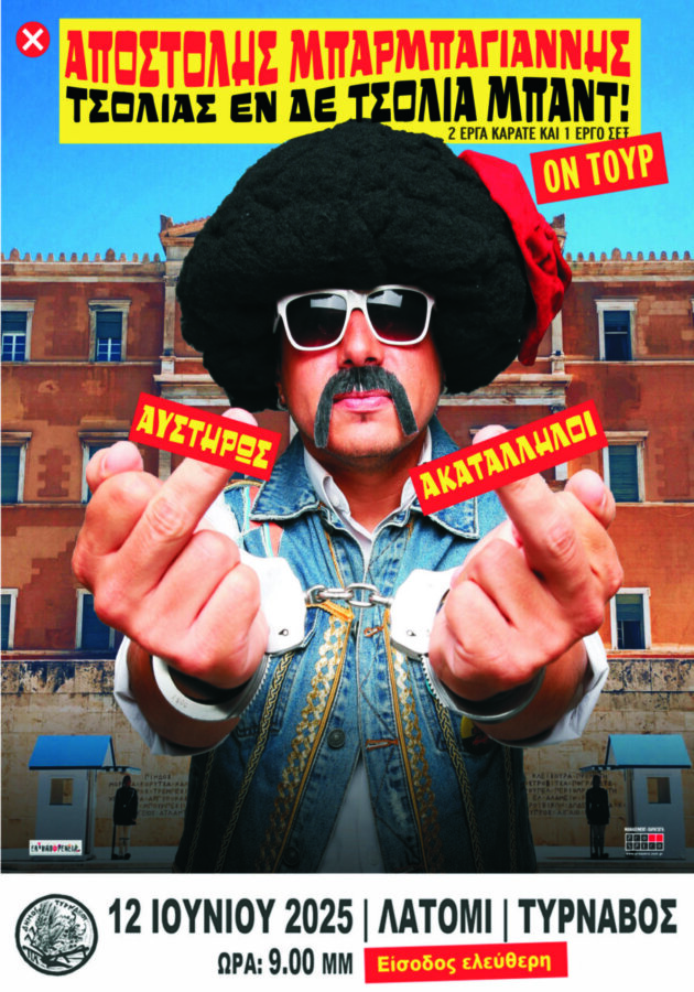 Ο Δήμος Τυρνάβου προσκαλεί το κοινό σε μια ξεχωριστή μουσικοσατιρική παράσταση με τον εκρηκτικό Αποστόλη Μπαρμπαγιάννη, γνωστό και ως «Τσολιά της Ελληνοφρένειας», και την μπάντα του, Τσολιάς εν δε Τσόλια Μπαντ, την Πέμπτη 12 Ιουνίου 2025, στις 21:00΄, στο ανοικτό θέατρο Τυρνάβου «Λατόμι».