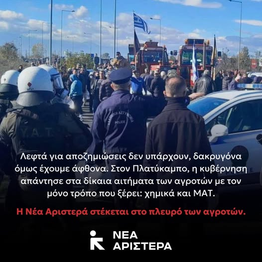 Σε ανακοίνωση της Νέας Αριστεράς σχετικά με τη χρήση χημικών στον Πλατύκαμπο και στον κόμβο της Νίκαιας στο πλαίσιο των αγροτικών κινητοποιήσεων, αναφέρει: