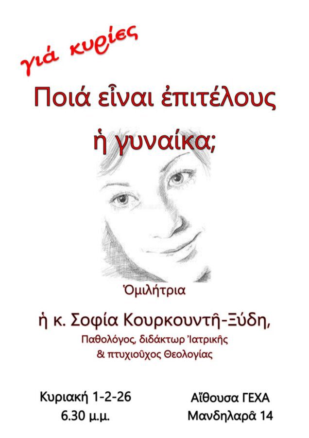 Την Κυριακή 1-2-2026, παραμονή της εορτής της Υπαπαντής του Κυρίου, και στις 6:30μ.μ. η κ. Σοφία Κουρκουντή-Ξύδη, παθολόγος, διδάκτωρ Ιατρικής και πτυχιούχος Θεολογίας, θα μιλήσει σε κυρίες στην αίθουσα της ΓΕΧΑ (Μανδηλαρά 14) με θέμα: Ποια είναι επιτέλους η γυναίκα;