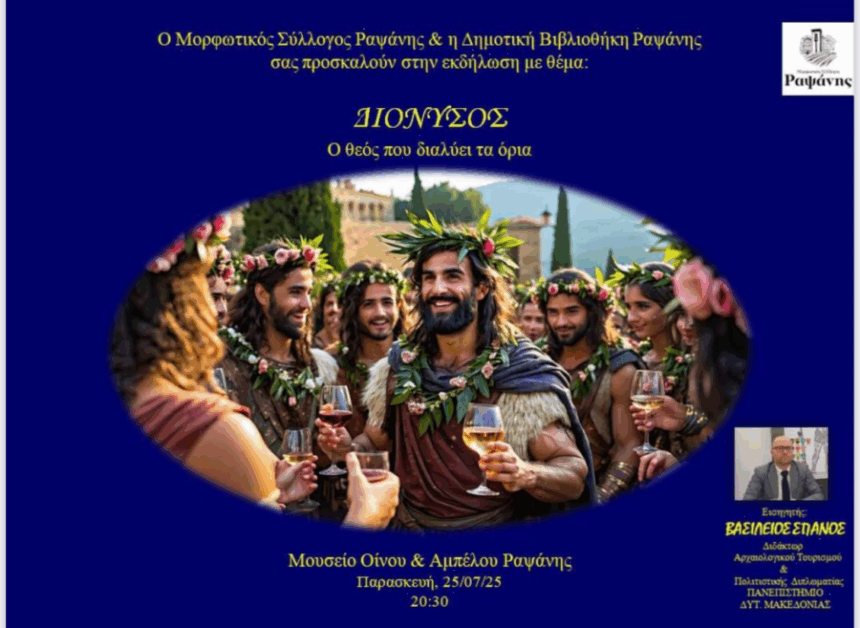 Έτσι λοιπόν την Παρασκευή 25 Ιουλίου 2025 στο Μουσείο Οίνου και Αμπέλου Ραψάνης, στις 8.30’ μ.μ. ο Βασίλειος Σπανός, Λέκτορας Αρχαιολογικού Τουρισμού & Πολιτιστικής Διπλωματίας του Πανεπιστημίου Δυτικής Μακεδονίας, θα μιλήσει με θέμα: «Διόνυσος, ο θεός που διαλύει τα όρια».