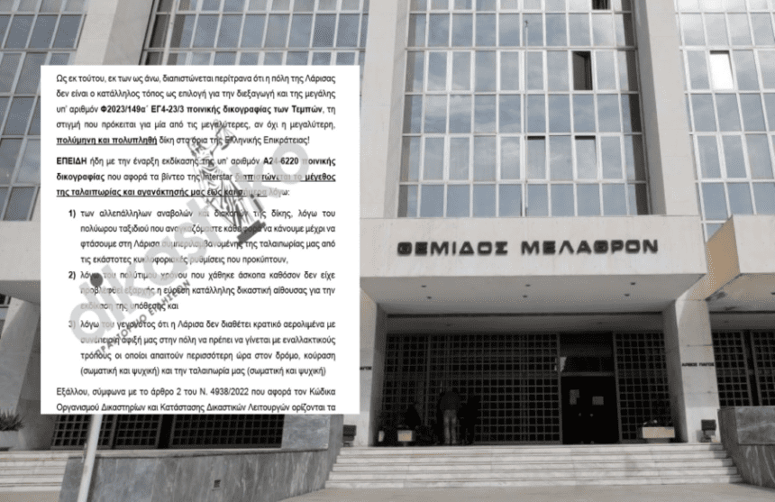 Το σχετικό έγγραφο, που παρουσιάζει σήμερα το dikastiko.gr, αναπτύσσει διεξοδικά τους λόγους για τους οποίους ζητείται η μεταφορά της έδρας από το Τριμελές Εφετείο Κακουργημάτων Λάρισας στη Θεσσαλονίκη ή, επικουρικώς, στο Εφετείο Αθηνών. Το αίτημα αποκτά επείγοντα χαρακτήρα, καθώς η έναρξη της μεγάλης δίκης έχει προγραμματιστεί για τις 23 Μαρτίου, ενώ οι υποδομές της Λάρισας έχουν ήδη δοκιμαστεί και κριθεί ανεπαρκείς σε παράλληλη δικαστική διαδικασία.