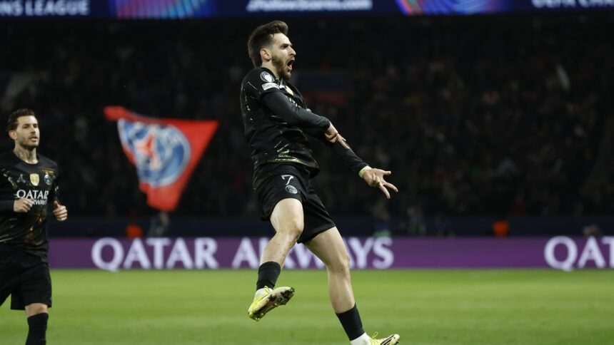 epa12812954 Khvicha Kvaratskhelia of PSG celebrates after scoring the 4-2 goal during the UEFA Champions League Round of 16 1st leg match Paris Saint-Germain against Chelsea FC, in Paris, France, 11 March 2026. EPA/MOHAMMED BADRA