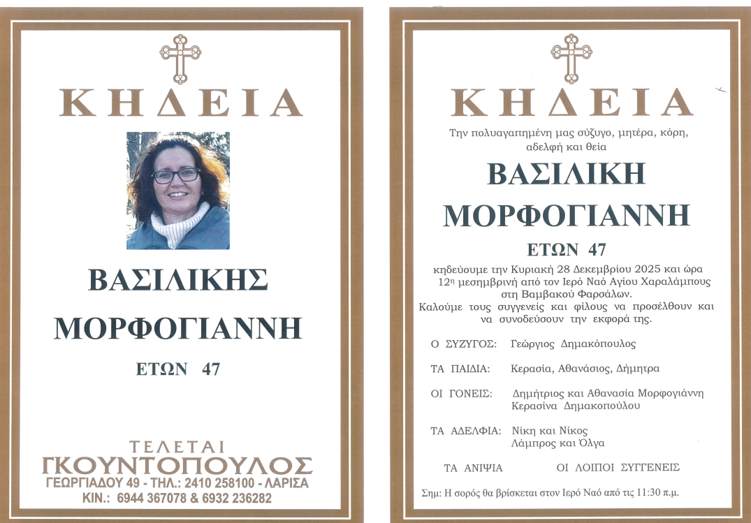 ΑρχικήΔΗΜΟΙ Ν ΛΑΡΙΣΑΣΕλλάδαΕπικαιρότητα Πέθανε η Βασιλική Μορφογιάννη Last updated: 27 Δεκεμβρίου 2025 18:46 elassonapr 2 ημέρες ago Share SHARE Έφυγε από τη ζωή σε ηλικία 47 ετών η Βασιλική Μορφογιάννη. Παράρτημα Λάρισας ΠΕΑΕΑ-ΔΣΕ: Τιμάμε τα 83 χρόνια από την Ανατίναξη της Γέφυρας του Γοργοποτάμου Κρίσιμη συνάντηση Τραμπ – Φον ντερ Λάιεν για τους δασμούς Πάτρα: Προφυλακίστηκαν οι δύο νεαροί για τη φωτιά στο Γηροκομείο Συντάξεις: Πώς θα καταργηθεί η προσωπική διαφορά Επιστροφή ενοικίου: Τι πρέπει να προσέξουν ενοικιαστές – ιδιοκτήτες TAGGED:ΕλλάδαΕπικαιρότιτα Share This Article Facebook Email Print Previous Article Θεσσαλονίκη: Διασωληνωμένος 67χρονος που έπεσε από ύψος μέσα σε κρεοπωλείο Next Article Χριστουγεννιάτικη αστροβραδιά στο «Καφέ της Επιστήμης της Περιφέρειας Θεσσαλίας» στην Καλαμπάκα
