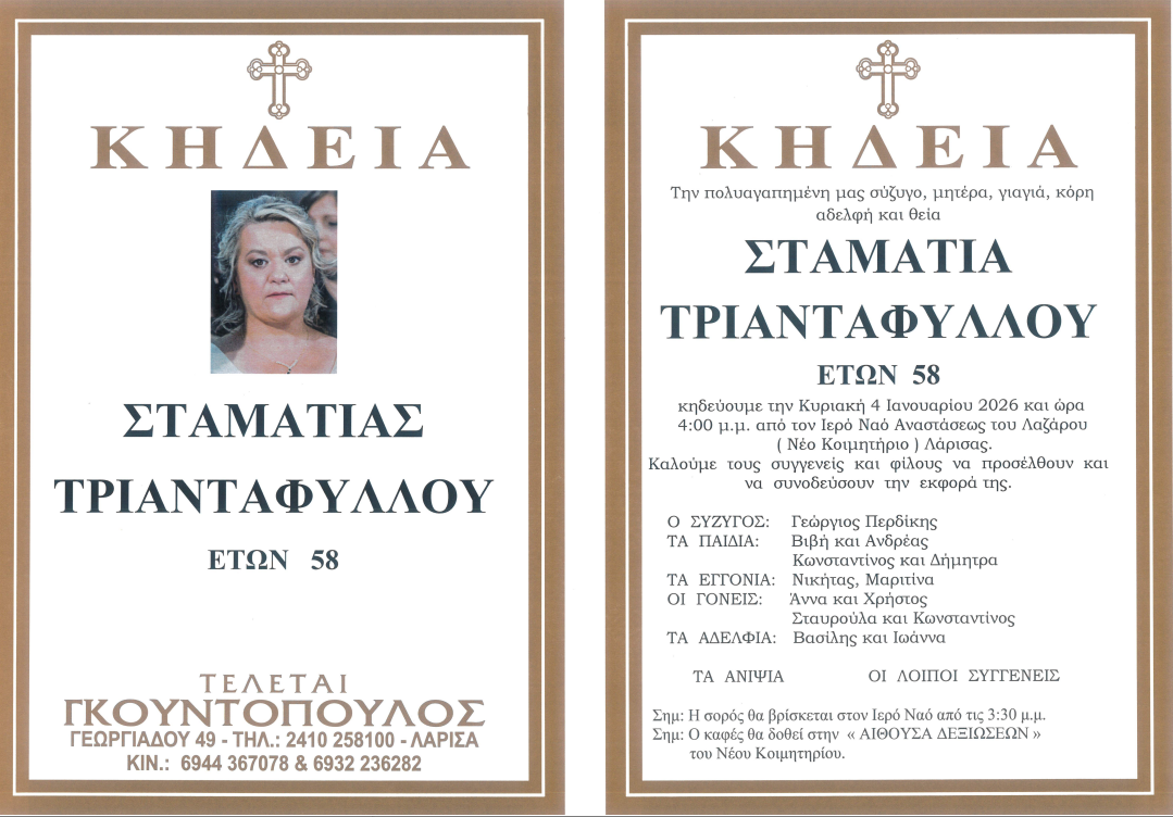 ΑρχικήΕλλάδαΕπικαιρότηταΛάρισα Πέθανε η Σταματία Τριανταφύλλου Last updated: 4 Ιανουαρίου 2026 11:38 elassonapr 1 εβδομάδα ago Share SHARE Έφυγε από τη ζωή σε ηλικία 58 ετών η Σταματία Τριανταφύλλου. Αυξήθηκαν κατά 61% οι εκταμιεύσεις δανείων προς τις επιχειρήσεις το 2024 Δραματικές ώρες στη Γάζα: Προελαύνουν οι IDF, διεθνής κατακραυγή Προϋπολογισμός: Στις 20.000 οι νέοι διορισμοί και προσλήψεις το 2026 Η ανακοίνωση της «Ευρωκλινικής» για τη λάθος μετάγγιση αίματος σε 67χρονο ασθενή Τελετή Υποδοχής της Ολυμπιακής Φλόγας στην Ελασσόνα TAGGED:ΕλλάδαΕπικαιρότιταΛαρισα Share This Article Facebook Email Print Previous Article Υποτονική η κίνηση στην αγορά της Λάρισας – Στις καφετέριες στράφηκε ο κόσμος (ΦΩΤΟ) Next Article Δήμος Λαρισαίων: Με λαμπρότητα τα Θεοφάνια στη Λάρισα – Δεξίωση και κοπή πίτας στο ΔΩΛ, με το πέρας της τελετής Αγιασμού των Υδάτων