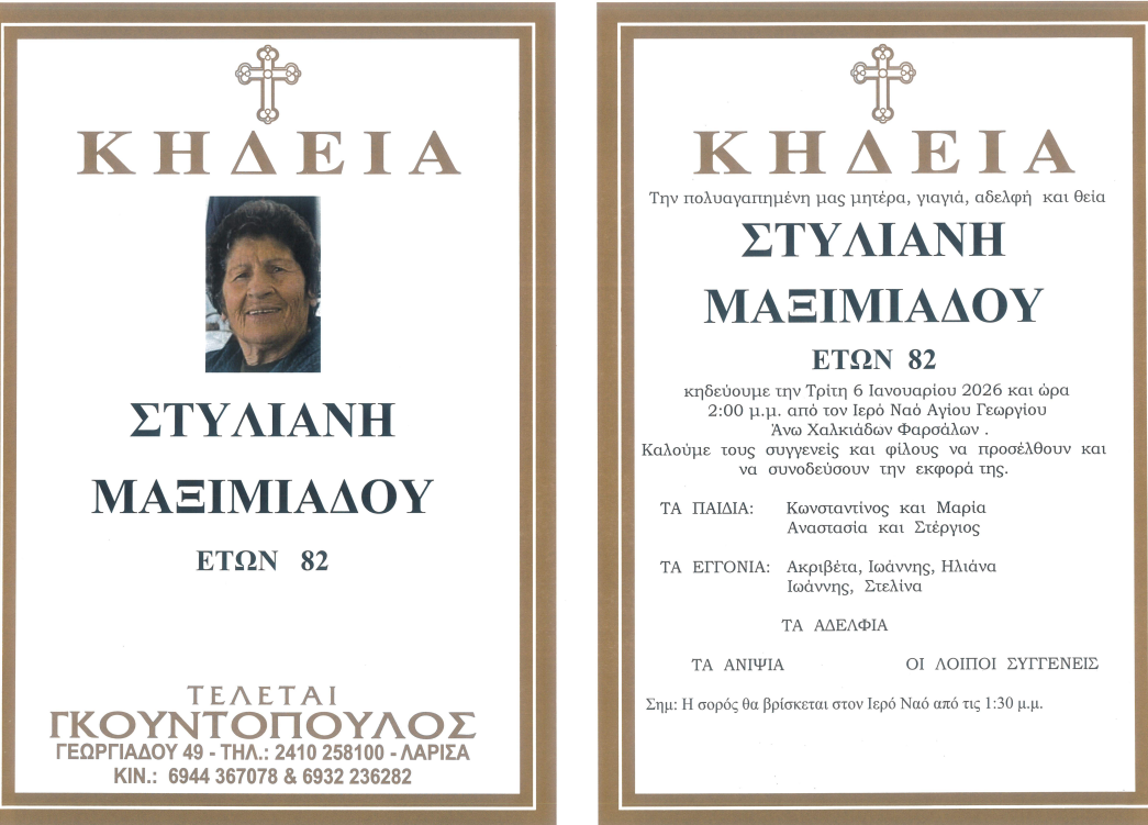 ΑρχικήΕλλάδαΕπικαιρότηταΛάρισα Πέθανε η Στυλιανή Μαξιμιάδου Last updated: 5 Ιανουαρίου 2026 19:43 elassonapr 1 εβδομάδα ago Share SHARE Έφυγε από τη ζωή η Στυλιανή Μαξιμιάδου σε ηλικία 82 ετών. «Η Περιφέρεια στην εποχή της Ετήσια μαθητική επίδειξη των τμημάτων της Μουσικής Σχολής Δήμου Τυρνάβου Εποχικοί πυροσβέστες κατά Βούλτεψη: «Καλό θα ήταν να μην μιλάει τις ώρες που χιλιάδες πυροσβέστες και πολίτες δίνουμε μάχη» Μ. Χαρακόπουλος με Υφ. Παιδείας: Το Πανεπιστήμιο Θεσσαλίας κυψέλη γνώσης, αλλά και πόλος ανάπτυξης Δραματικές ώρες στη Γάζα: Προελαύνουν οι IDF, διεθνής κατακραυγή TAGGED:ΕλλάδαΕπικαιρότιταΛαρισα Share This Article Facebook Email Print Previous Article Εργαστήριο Θεατρικού Παιχνιδιού στο Θεσσαλικό Θέατρο για παιδιά 6-12 ετών Next Article ΕΚΛ: “Κάτω τα χέρια από τον λαό της Βενεζουέλας!”