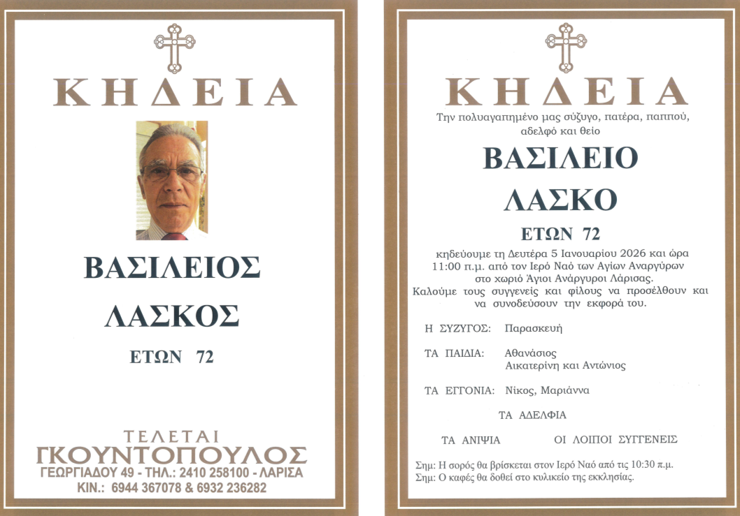 ΑρχικήΕλλάδαΕπικαιρότηταΛάρισα Πέθανε ο Βασίλειος Λάσκος Last updated: 4 Ιανουαρίου 2026 11:55 elassonapr 1 εβδομάδα ago Share SHARE Έφυγε από τη ζωή σε ηλικία 72 ετών ο Βασίλειος Λάσκος. Tηλεφωνική απάτη στη Θεσσαλονίκη- Απέσπασαν από ηλικιωμένο 370 λίρες Εργασίες σε νέο τμήμα της οδού Ανθ.Γαζή από Δευτέρα – Σε ισχύ κυκλοφοριακές ρυθμίσεις Η Περιφέρεια Θεσσαλία στη συνάντηση της Ελληνικής Σύμπραξης του Ευρωπαϊκού Έργου PortAbility ΔΥΠΑ: Υποχώρησε κατά 6,2% η ανεργία τον μήνα Ιούλιο Χατζηδάκης για αγρότες: Η κυβέρνηση δεν θα μείνει θεατής TAGGED:ΕλλάδαΕπικαιρότιταΛαρισα Share This Article Facebook Email Print Previous Article Η πρώτη Πανσέληνος του 2026 (φωτο) Next Article Κομμουνιστική Απελευθέρωση: Κάτω τα χέρια από τη Βενεζουέλα