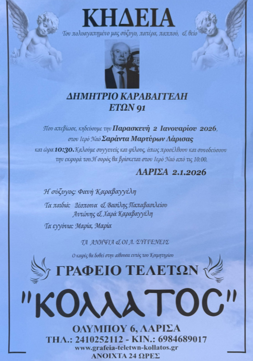ΑρχικήΕλλάδαΕπικαιρότηταΛάρισα Πέθανε ο Δημήτριος Καραβαγγέλης Last updated: 1 Ιανουαρίου 2026 18:52 elassonapr 2 εβδομάδες ago Share SHARE Έφυγε από τη ζωή σε ηλικία 91 ετών ο Δημήτριος Καραβαγγέλης. Κάλεσμα της Πανελλαδικής Επιτροπής Μπλόκων στη σύσκεψη του Σαββάτου στη Νίκαια Γενικός Επιθεωρητής Στρατού ο Αντιστράτηγος Στ. Παπασταθόπουλος-Παραμένει Αρχηγός Τακτικής Αεροπορίας ο Αντιπτέραρχος Π. Γεωργακόπουλος Ευρωπαϊκό πρωτάθλημα Κ18: Στον τελικό η Ελλάδα συντρίβοντας την Ιταλία Αλληλοεξουδετερώθηκαν στην πρώτη… μάχη της σεζόν Πανιώνιος και Καλαμάτα Τράπεζες: Το στοίχημα της πιστωτικής επέκτασης – Στόχος για νέα δάνεια πάνω από 13 δισ. το 2025 TAGGED:ΕλλάδαΕπικαιρότιταΛαρισα Share This Article Facebook Email Print Previous Article Μαθητές του Προτύπου ΓΕΛ Λάρισας σε workshop κβαντικών υπολογιστών Next Article Αγρυπνία για τις Μεγάλες και Βασιλικές Ώρες των Θεοφανείων στον Άγιο Αχίλλιο