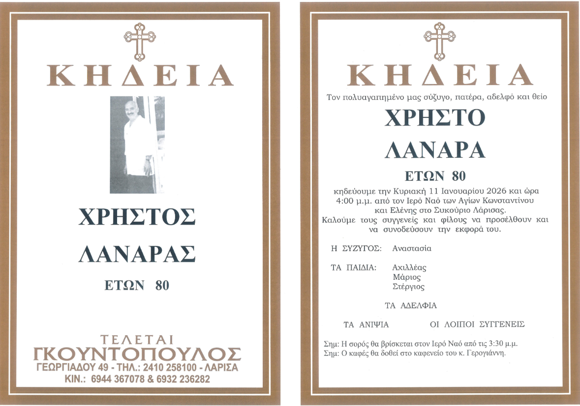 ΑρχικήΔΗΜΟΙ Ν ΛΑΡΙΣΑΣΕλλάδαΕπικαιρότητα Πέθανε ο Χρήστος Λανάρας Last updated: 11 Ιανουαρίου 2026 13:25 elassonapr 2 ημέρες ago Share SHARE Έφυγε από τη ζωή σε ηλικία 80 ετών ο Χρήστος Λανάρας Σεμερτζίδου για ΟΠΕΚΕΠΕ: Μας έμπλεξαν – Δεν είμαστε από τους εμπλεκόμενους με το 1,7 εκατ. ευρώ Συναγερμός στις Αρχές: Πτώμα άνδρα επέπλεε στον Ισθμό της Κορίνθου Συνεδριάζει το υπουργικό συμβούλιο υπό τον πρωθυπουργό ΛΕΞ: Ξεσήκωσε τη Θεσσαλονίκη με τη συναυλία του – Περισσότερα από 45.000 άτομα στο Καυτανζόγλειο Συντάξεις Ιανουαρίου: Από τις 19 Δεκεμβρίου ξεκινά η καταβολή τους – Αναλυτικά τα ταμεία και η ημερομηνίες TAGGED:ΕλλάδαΕπικαιρότιτα Share This Article Facebook Email Print Previous Article Αναβάλλεται εκδήλωση στη Γλαύκη Next Article Η πρώτη ανασκόπηση Μητσοτάκη για το 2026