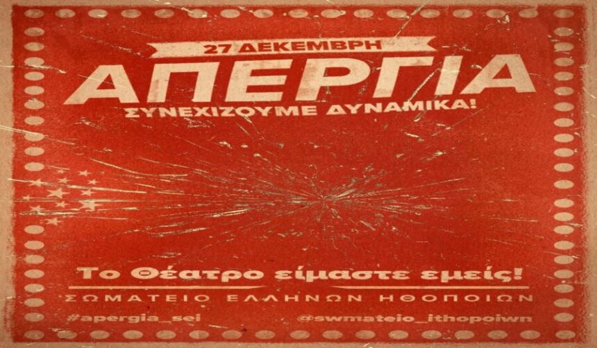 «Απεργία στα θέατρα σήμερα Σάββατο 27 Δεκεμβρίου. Το “Συνεργείο Μουσικού Θεάτρου” (ΣΜΟΥΘ) στη Λάρισα σε ανάρτησή του ενημερώνει πως η σημερινή παράσταση δεν θα πραγματοποιηθεί λόγω συμμετοχής των ηθοποιών στην Απεργία που έχει Προκηρύξει το Σωματείο Ελλήνων Ηθοποιών!