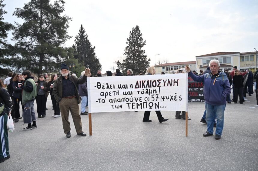 Ανταποκρινόμενοι στο κάλεσμα φορέων της Λάρισας, πάρα πολλοί άνθρωποι ακόμη και εκτός Λάρισας βρέθηκαν έξω από το Συνεδριακό Κέντρο του “Γαιόπολις” όπου και φιλοξενεί τη δίκη για το σιδηροδρομικό δυστύχημα των Τεμπών, ζητώντας να αποδοθεί δικαιοσύνη.