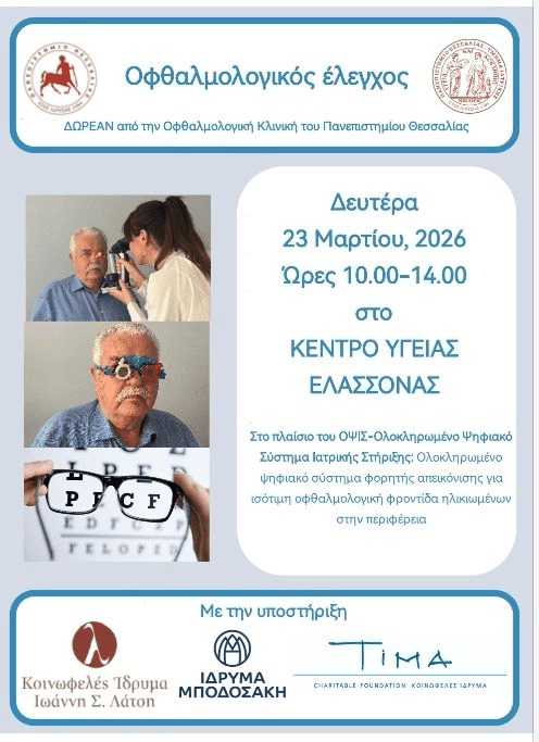 Δευτέρα 23/3/2026 στο ΚΕΝΤΡΟ ΥΓΕΙΑΣ ΕΛΑΣΣΟΝΑΣ θα διενεργήθει Προληπτικός Οφθαλμίατρικος Έλεγχος από τις 10.00 μέχρι της 14.00.