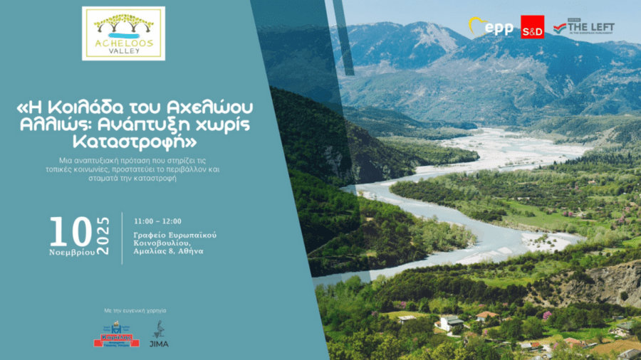 Μια νέα προοπτική για την ανάπτυξη της Κοιλάδας του Αχελώου αναδεικνύεται τη Δευτέρα 10 Νοεμβρίου 2025, στις 11:00, στο Γραφείο του Ευρωπαϊκού Κοινοβουλίου στην Ελλάδα (Λεωφ. Αμαλίας 8, Σύνταγμα), μέσα από την εκδήλωση με τίτλο: «Η Κοιλάδα του Αχελώου Αλλιώς: Ανάπτυξη χωρίς καταστροφή.» Μια πρωτοβουλία συνεργασίας Πολιτών, Θεσμών και Ευρώπης για το μέλλον της Ορεινής Υπαίθρου. Μια αναπτυξιακή πρόταση που στηρίζει τις τοπικές κοινωνίες, προστατεύει το περιβάλλον και σταματά την καταστροφή.