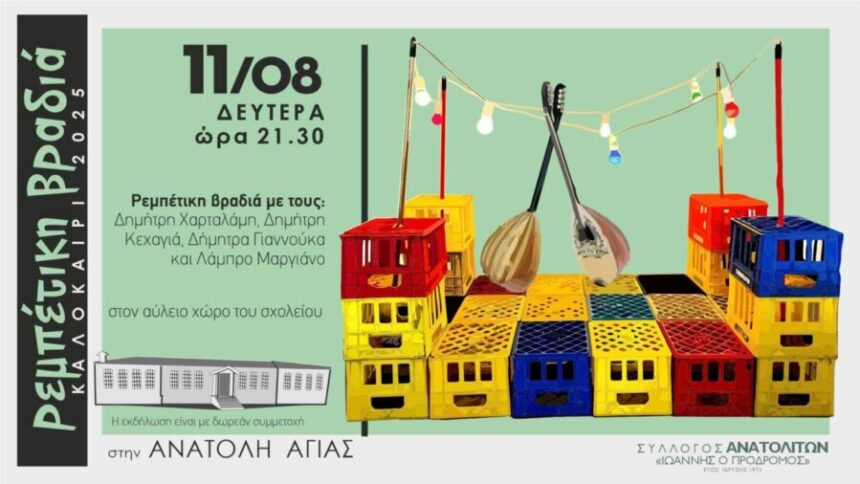 Ο Σύλλογος Ανατολιτών «Ιωάννης ο Πρόδρομος» σας προσκαλεί σε μια μουσική βραδιά γεμάτη ρεμπέτικους ήχους, τη Δευτέρα 11 Αυγούστου 2025, στις 21:30, στον αύλειο χώρο του σχολείου στην Ανατολή Αγιάς.