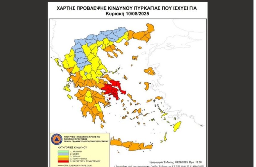 Όπως προβλέπεται με τον Ημερήσιο Χάρτη Πρόβλεψης Κινδύνου Πυρκαγιάς της Γενικής Γραμματείας Πολιτικής Προστασίας, για την Κυριακή 10 Αυγούστου 2025, προβλέπεται Κατηγορία Κινδύνου 3 (υψηλή) για την Π.Ε. Λάρισας, για τις Π.Ε. Μαγνησίας & Σποράδων και για περιοχές της Π.Ε. Καρδίτσας (περιοχή αρμοδιότητας δασαρχείου Καρδίτσας).