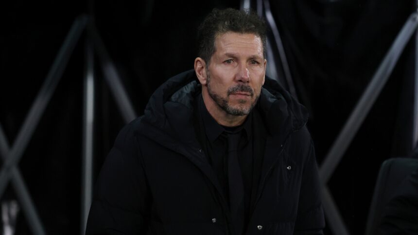 Atletico Madrid's head coach Diego Simeone enters the pitch before the Champions League play-off first leg soccer match between Club Brugge and Atletico Madrid, in Bruges, Belgium, Wednesday, Feb. 18, 2026. (AP Photo/Omar Havana)