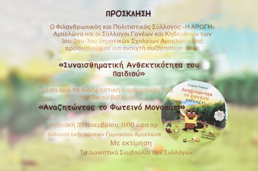 Ο Φιλανθρωπικός και Πολιτιστικός Σύλλογος «H ΑΡΩΓΗ» Αμπελώνα συνδιοργανώνει με τους Συλλόγους Γονέων και Κηδεμόνων των 1ο, 2ο και 3ο Δημοτικών Σχολείων Αμπελώνα, μία ξεχωριστή και βιωματική εκδήλωση που θα πραγματοποιηθεί την Κυριακή 30 Νοεμβρίου 11:00 π.μ στην αίθουσα εκδηλώσεων του Γυμνασίου Αμπελώνα Λάρισας.