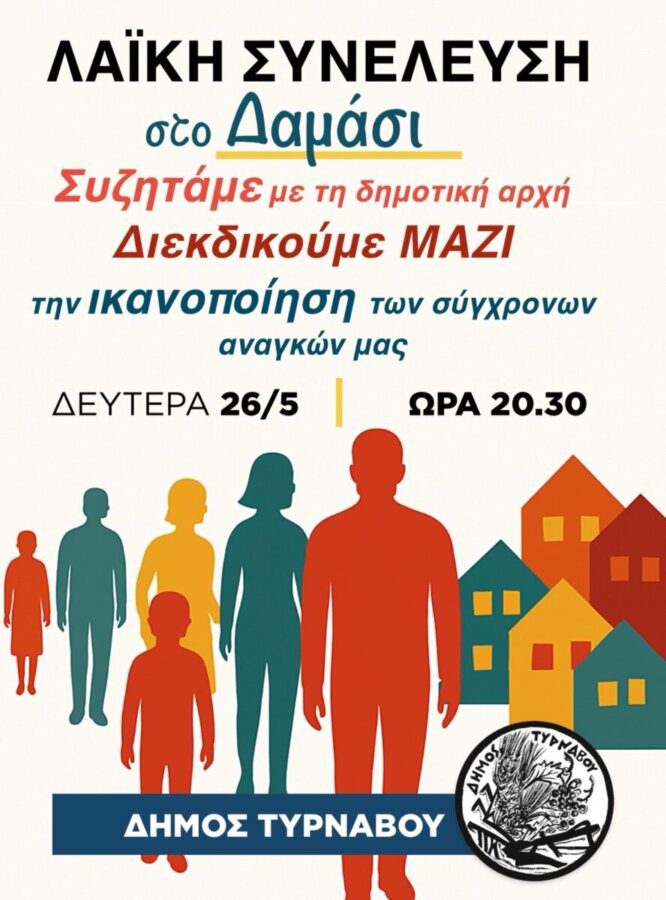 Ο Δήμος Τυρνάβου συνεχίζει έναν κύκλο λαϊκών συνελεύσεων στα χωριά του Δήμου, με στόχο την άμεση επαφή με τους κατοίκους, την καταγραφή των αναγκών και τον κοινό αγώνα για την ικανοποίησή τους.