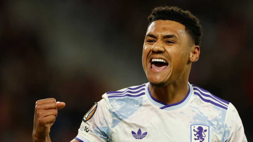 Aston Villa's Ollie Watkins celebrates after scoring during a first leg, round of 16 Europa League soccer match between Lille and Aston Villa in Lille, France, Sunday, Feb. 22, 2026. (AP Photo/Jean-Francois Badias)