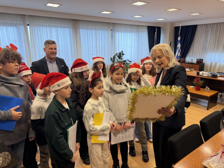 Πανευτυχής η Ρένα Καραλαριώτου, μετά την επίσκεψη των μικρών μαθητών του 25ου Δημοτικού σχολείου, που την επισκέφτηκαν στο γραφείο της στην Αποκεντρωμένη Διοίκηση για να της πουν τα κάλαντα και της έδωσαν ως χριστουγεννιάτικο δώρο ένα έργο που έφτιαξαν μόνοι τους.
