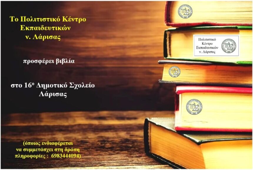 Το Πολιτιστικό Κέντρο Εκπαιδευτικών νομού Λάρισας – ΠΟΚΕΛ θα προσφέρει βιβλία στο 16ο Δημοτικό Σχολείο Λάρισας, μετά από πρόσκληση της διευθύντριας Δραγατογιάννη Παναγιώτας και πρωτοβουλία του εκπαιδευτικού Στεργίου Γρηγόρη, προκειμένου να ενισχυθεί η σχολική βιβλιοθήκη με νέους τίτλους βιβλίων.