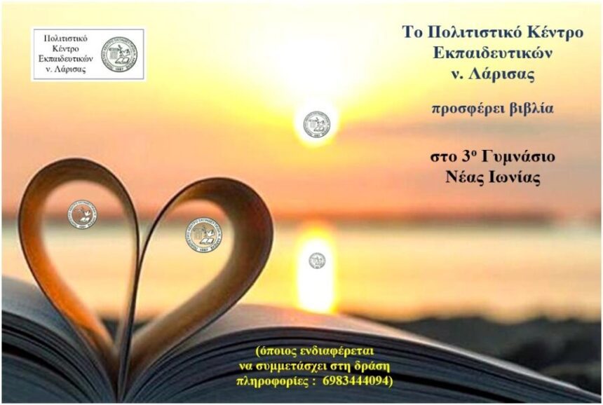 Το Πολιτιστικό Κέντρο Εκπαιδευτικών νομού Λάρισας – ΠΟΚΕΛ θα προσφέρει βιβλία στο 3ο Γυμνάσιο Νέας Ιωνίας, μετά από πρόσκληση του διευθυντή του σχολείου Πλαγερά Αντώνη και πρωτοβουλία του εκπαιδευτικού Λεϊμονή Διονύση, ώστε να ενισχυθεί η φιλαναγνωσία των μαθητών και η σχολική βιβλιοθήκη με νέους τίτλους βιβλίων.
