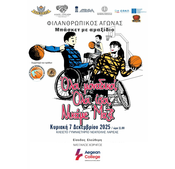 Με αφορμή την Παγκόσμια Ημέρα Ατόμων με Αναπηρία (3 Δεκεμβρίου), το Aegean College συμμετέχει ως Μεγάλος Χορηγός στη σημαντική φιλανθρωπική εκδήλωση «Όλοι μοναδικοί, Όλοι ίσοι, Νικάμε ΜΑΖΙ», που διοργανώνεται την Κυριακή 7 Δεκεμβρίου 2025, στις 11:00, στο Κλειστό Γυμναστήριο Νεάπολης Λάρισας.