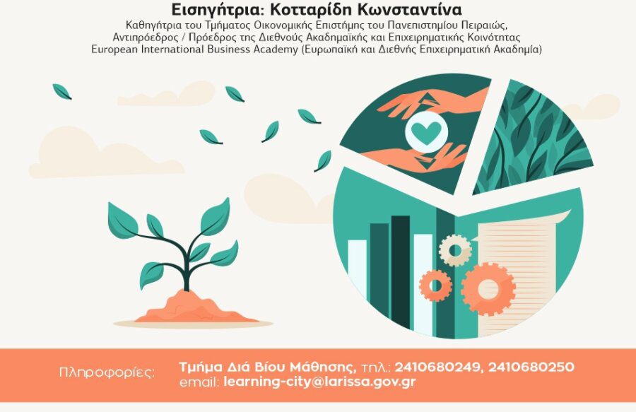 Η επόμενη διάλεξη με τίτλο «Τα πιο πρακτικά βιώσιμα επιχειρηματικά μοντέλα για Επιχειρήσεις και Δήμους» θα πραγματοποιηθεί την Πέμπτη 5 Φεβρουαρίου 2026, στις 18:00, στο Γαλλικό Ινστιτούτο Λάρισας με ομιλήτρια την καθ. Κωνσταντίνα Κοτταρίδη.