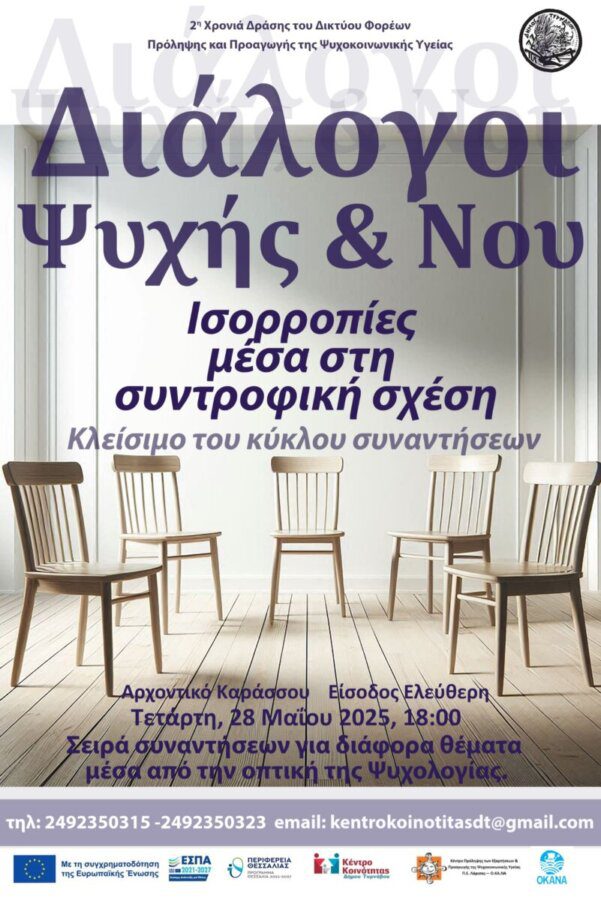 Το Κέντρο Κοινότητας του Δήμου Τυρνάβου διοργανώνει αυτή τη σειρά συναντήσεων με τίτλο «Διάλογοι Ψυχής & Νου» που σκοπό έχουν την συζήτηση πάνω σε διάφορα ζητήματα καθημερινότητας μέσα από την οπτική της Ψυχολογίας.