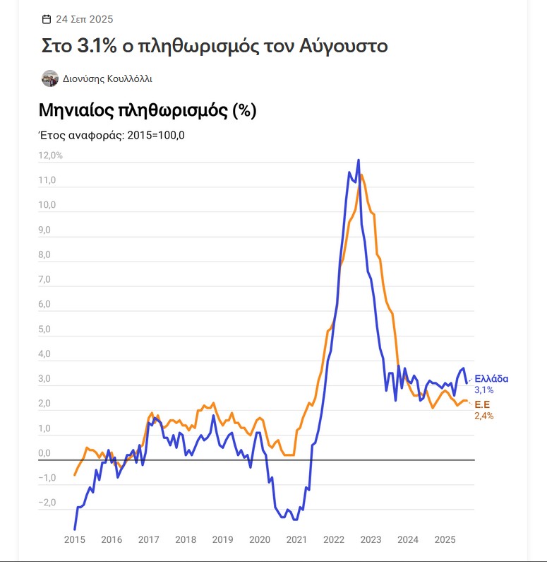 Συγκεκριμένα, από τον Οκτώβριο του 2022 έως και τον Δεκέμβριο του 2023 (14 μήνες), ο ελληνικός πληθωρισμός ήταν χαμηλότερος του μέσου όρου της Ε.Ε., ενώ για την υπόλοιπη περίοδο της πληθωριστικής κρίσης έως και σήμερα (18 μήνες) ο πληθωρισμός ήταν ψηλότερος στη χώρα μας από την Ε.Ε. Μόνον τον περασμένο Σεπτέμβριο ο πληθωρισμός στη χώρα μας (1,8%) υποχώρησε κάτω από τον ευρωπαϊκό μέσο όρο (2,6%) και της Ευρωζώνης (2,2%).