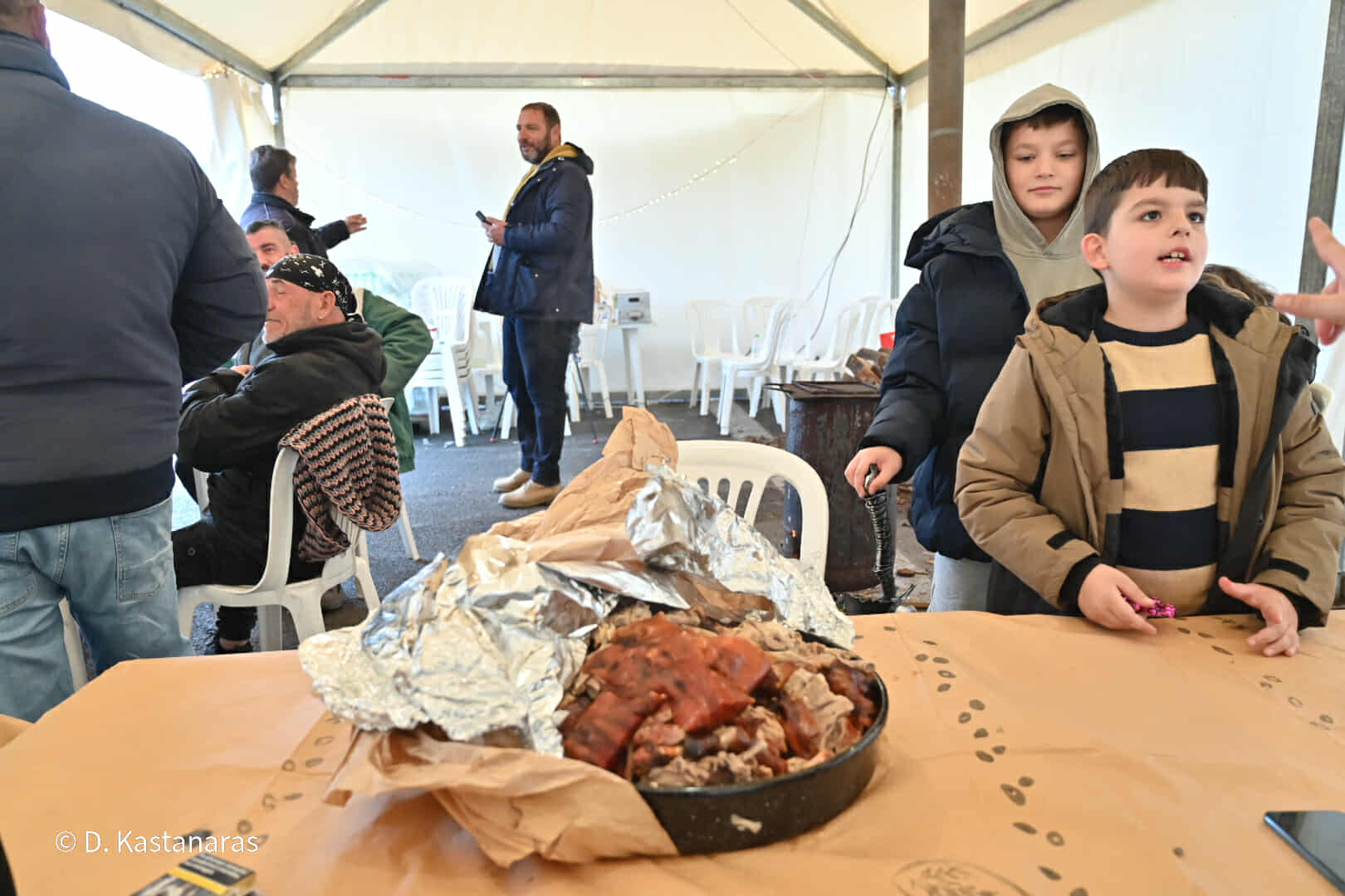 Μέσα στις σκηνές με ψητό γουρουνόπουλο, αντάλλαξαν ευχές μεταξύ τους αλλά και με τους διερχόμενους οδηγούς προς Αθήνα, οι οποίοι σταματούσαν για να ανταλλάξουν λίγα λόγια και να ευχηθούν «καλές γιορτές».