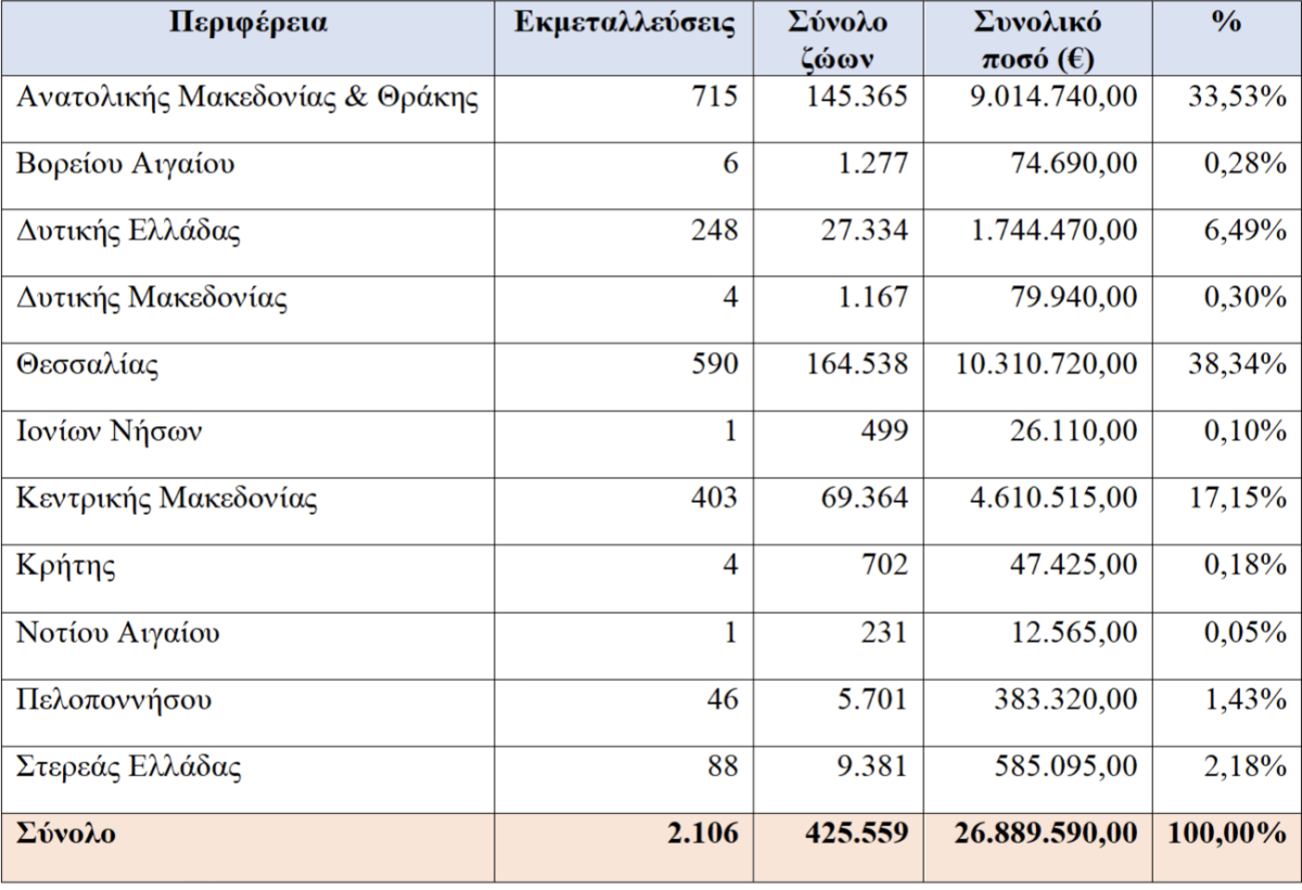 Από το συνολικό ποσό των 26.889.590 ευρώ, τα 23.990.050 ευρώ (89,2%) αντιστοιχούν στα «μεγάλα» ζώα και τα 2.899.540 ευρώ (10,8%) στα «μικρά» ζώα.
