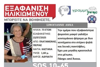 Εξαφάνιση 73χρονης στον Πλαταμώνα – Silver alert για τον εντοπισμό της
