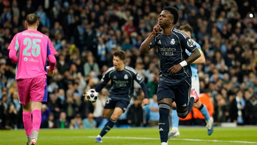 Η Ρεάλ Μαδρίτης υπέταξε ξανά την Μάντσεστερ Σίτι και με δύο νίκες σφράγισε την πρόκριση στα προημιτελικά του UEFA Champions League, καθώς ο Βινίσιους οδήγησε την “Βασίλισσα” στο να επικρατήσει με 2-1 στην Αγγλία και να περάσει θριαμβευτικά στην επόμενη φάση.