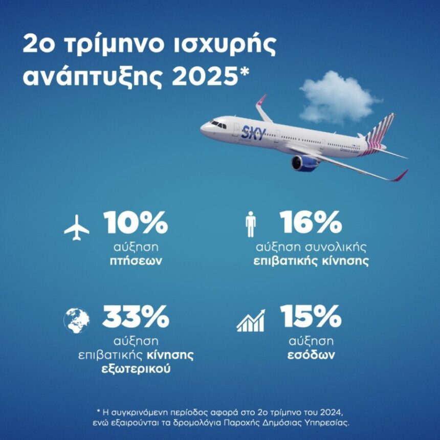 Με σταθερά ανοδική πορεία, η SKY express κατέγραψε αξιοσημείωτες επιδόσεις και κατά το δεύτερο τρίμηνο του 2025, επιβεβαιώνοντας τη δυναμική της ανάπτυξη στην Ελλάδα και το εξωτερικό. Η συνολική επιβατική κίνηση της εταιρείας παρουσίασε άνοδο κατά 16% σε σύγκριση με το αντίστοιχο διάστημα του 2024 ενώ τα συνολικά έσοδά από πτήσεις αυξήθηκαν κατά 15%.