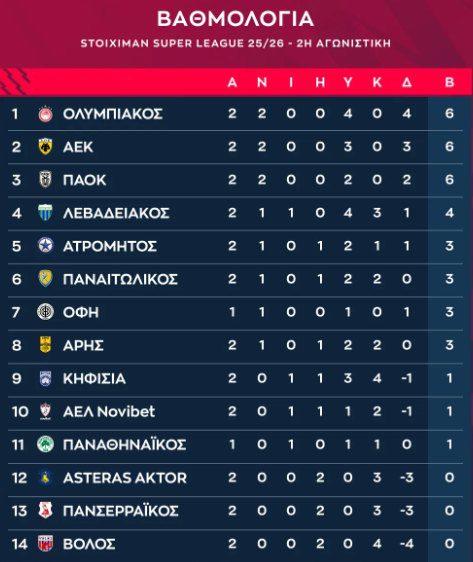 Δείτε πώς έχει διαμορφωθεί η βαθμολογία της Stoiximan Super League μετά την ισοπαλία Παναθηναϊκού, Λεβαδειακού και την ολοκλήρωση της 2ης αγωνιστικής. Το τριφύλλι έκανε εκκίνηση με ισοπαλία στο νέο πρωτάθλημα, τέταρτοι οι Βοιωτοί.